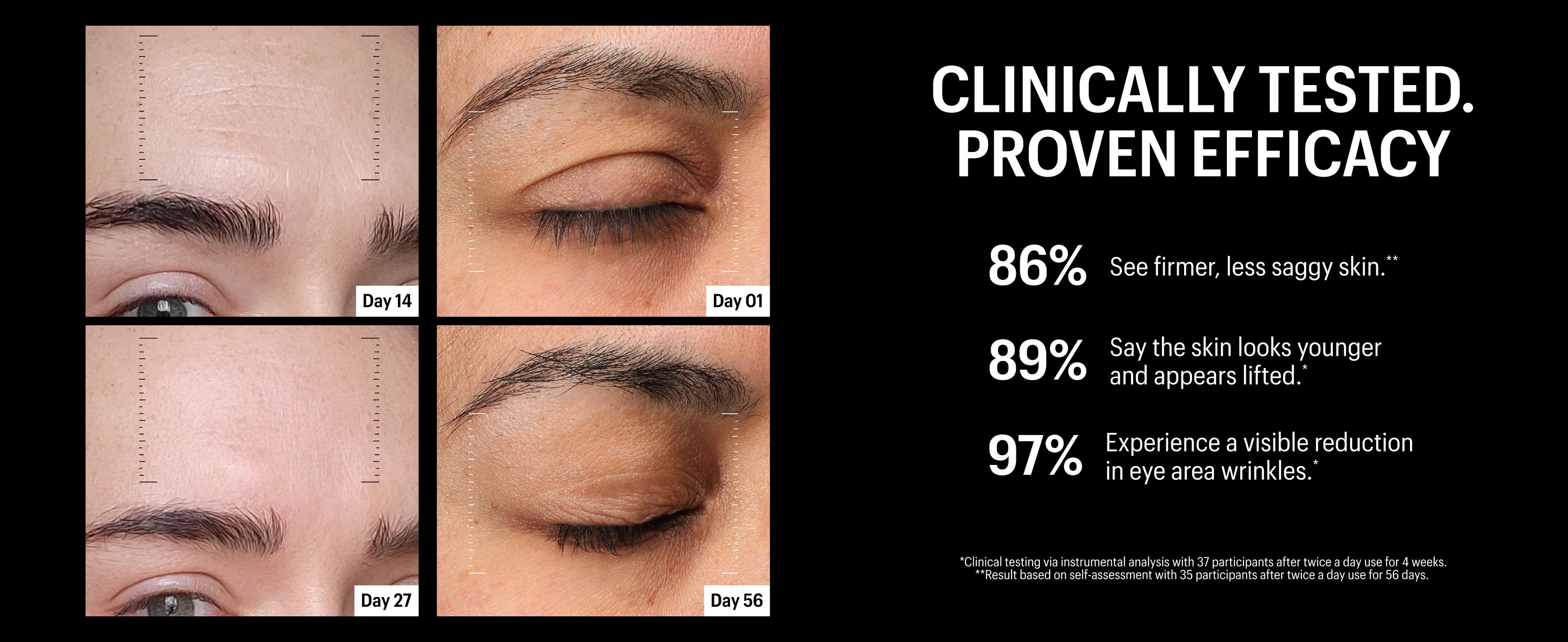 Rather than only highlighting long-term outcomes, the brand also emphasized shorter testing windows, showcasing results observed during clinical trials at Day 1, Day 14, and Day 28.